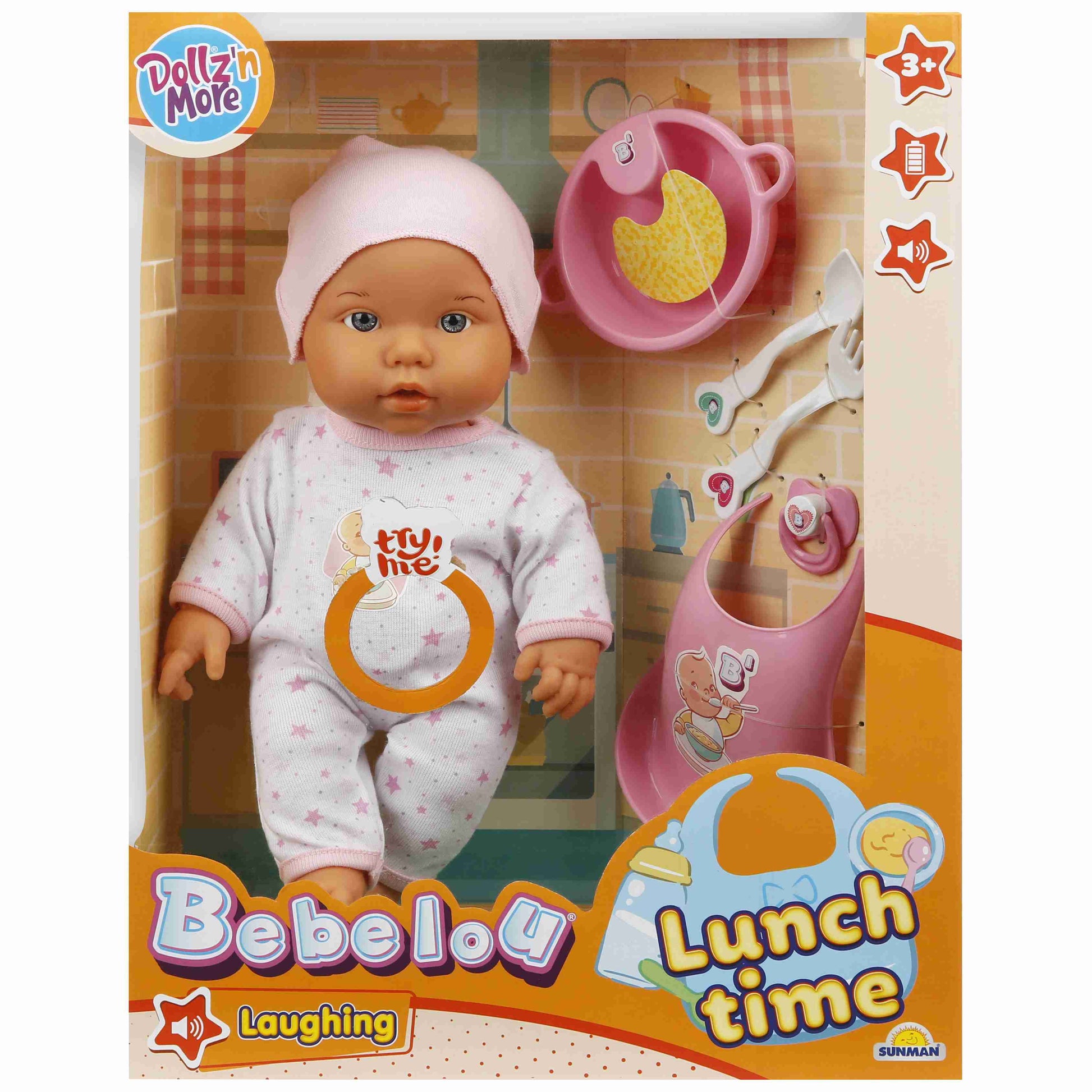 בובת תינוק 35 סמ טיפול והאכלה. משמיעה קולות צחוק. נדרשות 2 סוללות כפתור LR44 (לא כלולות-לרכישה בנפרד). לגילאי 3 שנים ומעלה. מידות האריזה: 29.2X13X38 ס"מ. (נמכרת בצבעים כחול או ורוד- יסופק בהתאם לזמינות בסניפים).
