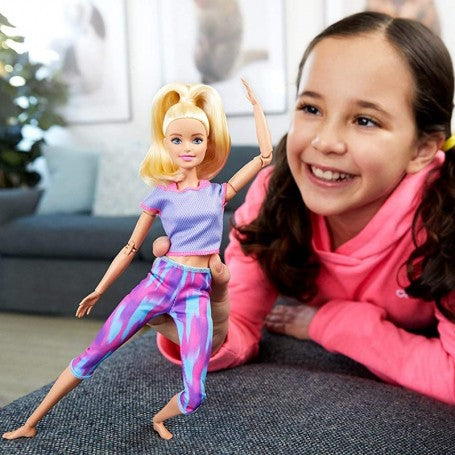 ילדים יכולים לתרגל טיפוח עצמי כשהם עוזרים לבובת ברבי להטען מחדש! בובה גמישה במיוחד למשחק מלא תנועה ושלווה.