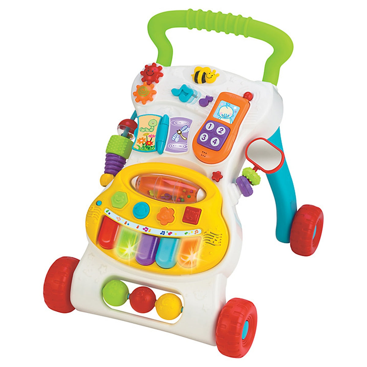 להליכון לתינוק ידית לדחיפה ולשיפור שיווי המשקל, מערכת פעלולון אלקטרוני אינטרקטיבית כולל פסנתר, טלפון, ספר, כפתורי הפעלה, רעשנים מסתובבים.