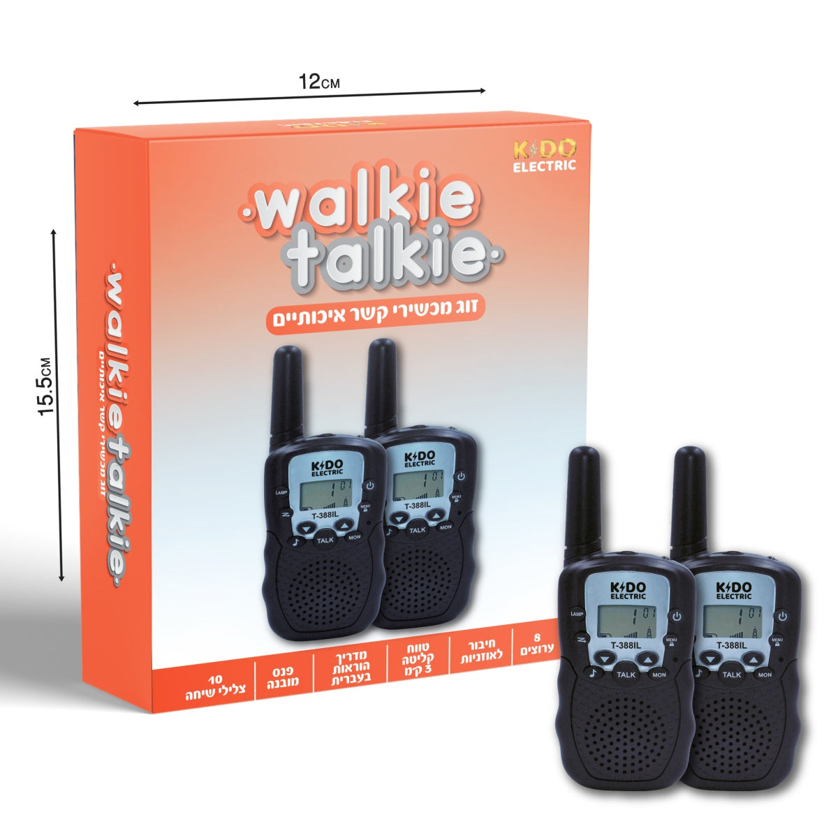 זוג מכשירי קשר איכותיים לילדים. טווח קליטה 3 ק״מ. 8 ערוצים. פנס מובנה. חיבור לאוזניות. כולל סוללות מתנה.