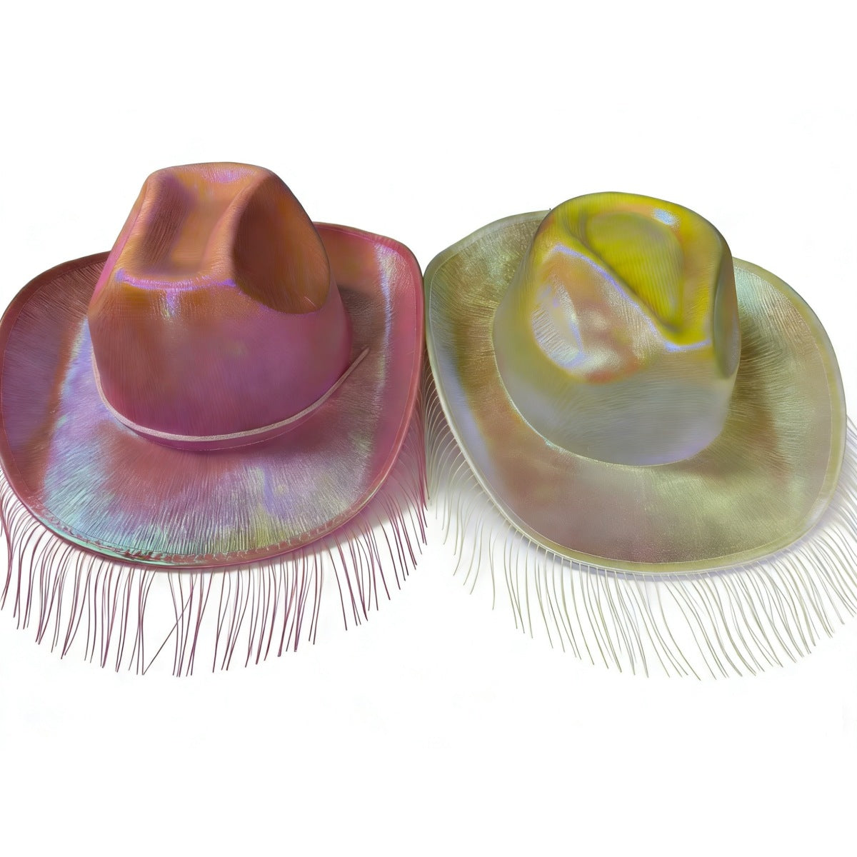 כובע קאובוי הולוגרפי עם פרנזים הוא אביזר מסיבות אולטימטיבי שמוסיף גלאם, נוכחות וסטייל עתידני לכל אירוע. הוא משלב את המראה הקלאסי של המערב הפרוע עם הולוגרמה מנצנצת ופרנזים תלויים.