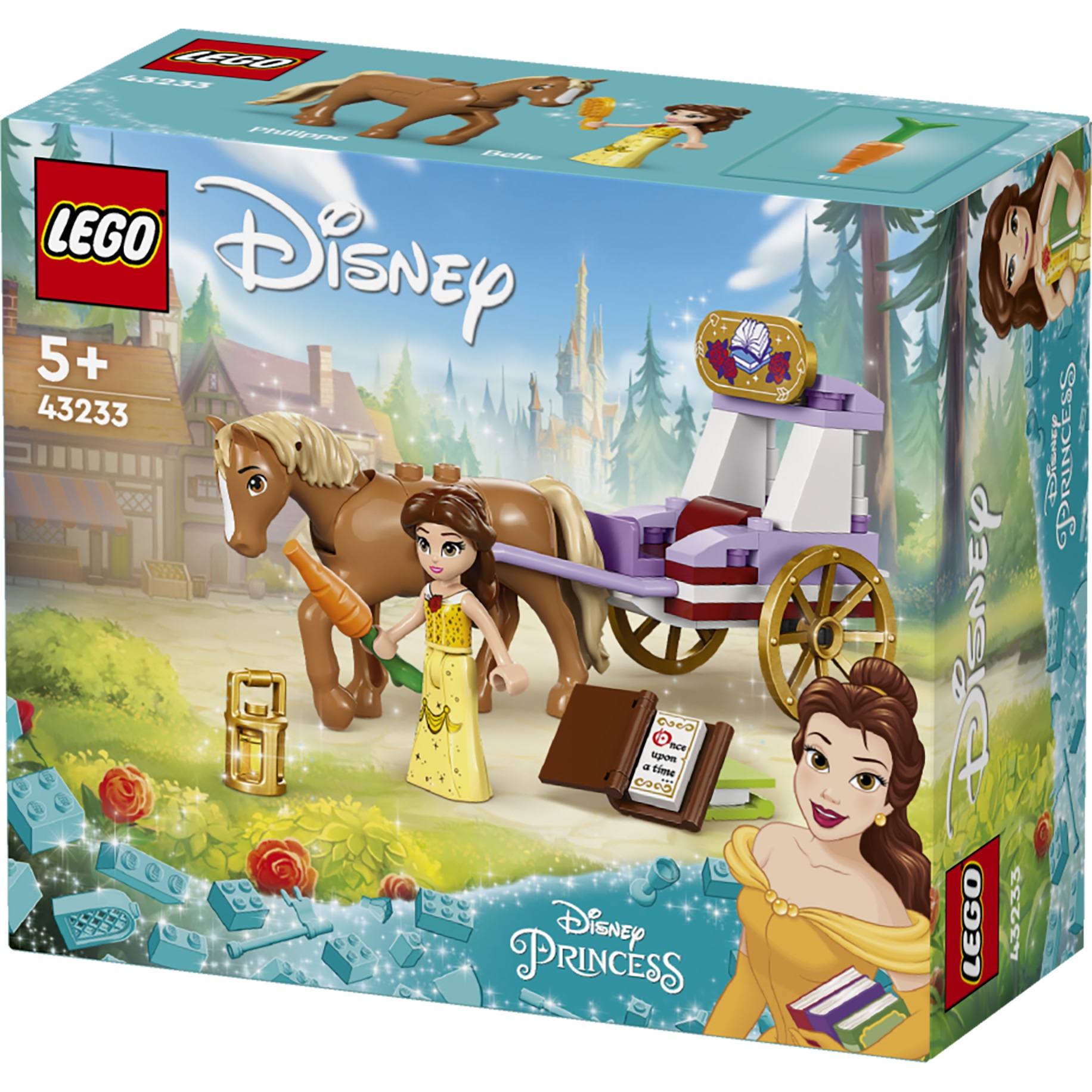 ערכת ההרכבה והמשחק ׳כרכרת הסוסים משעת הסיפור של בל׳ (43233) מסדרת LEGO® ǀ Disney Princess. הכוללת כרכרה עם מושב ומקום מאחור ל-2 ספרים, עששית ושאר התחלות סיפור. כולל דמות מיני-בובת בל ודמות של הסוס פיליפ כדי להתחיל את המשחק, בתוספת 2 טבעות לאספנות עם עיטורים הניתנים להחלפה.