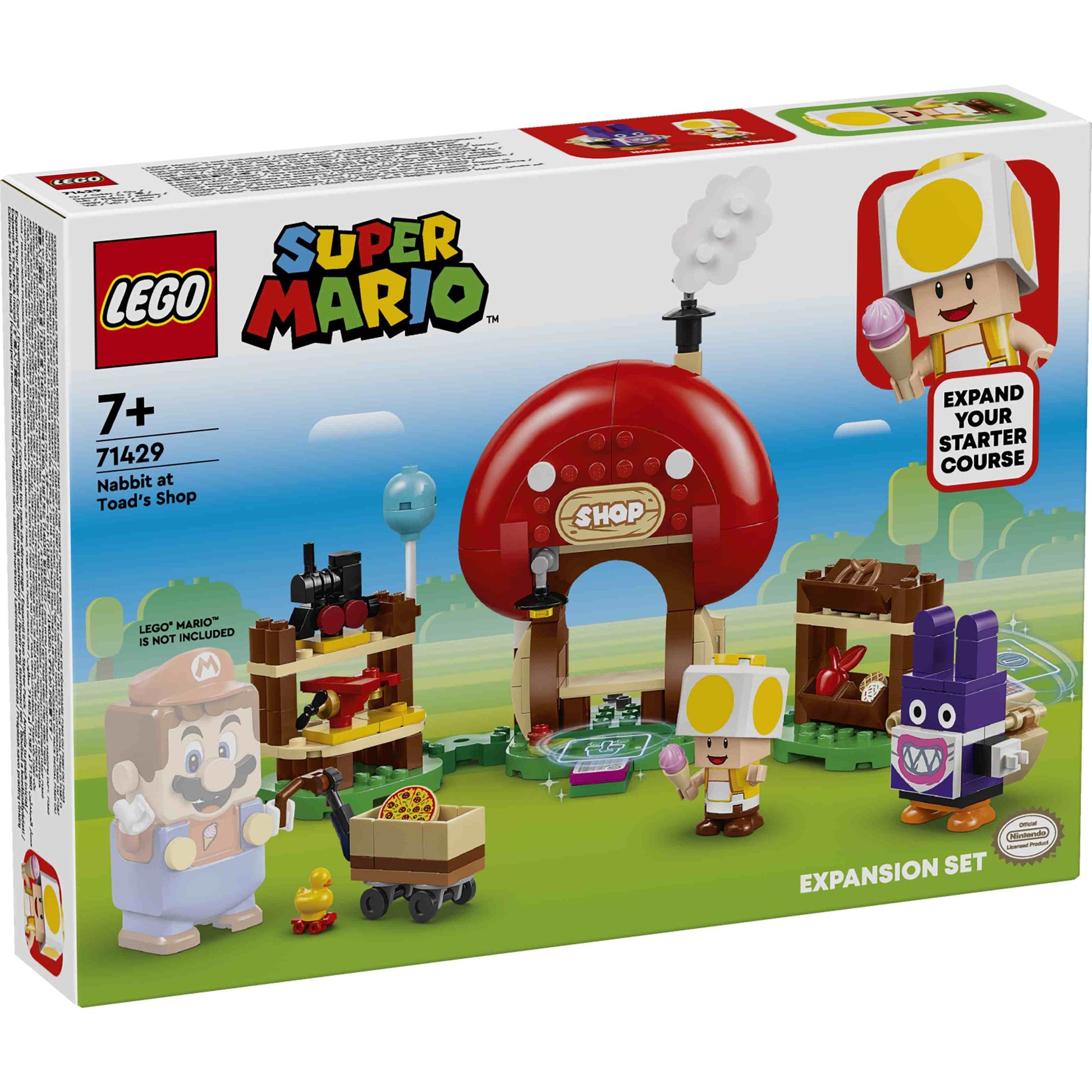 ערכת הרחבה של LEGO Super Mario (71429) הכוללת 2 דמויות סופר מריו בנויות לבנים – דמות של טואד צהוב ושל נאביט – בתוספת חנות הניתנת להרכבה עם מגוון אביזרי צעצועים/מזון ועגלת קניות שיעניקו השראה למשחק תפקידים יצירתי.