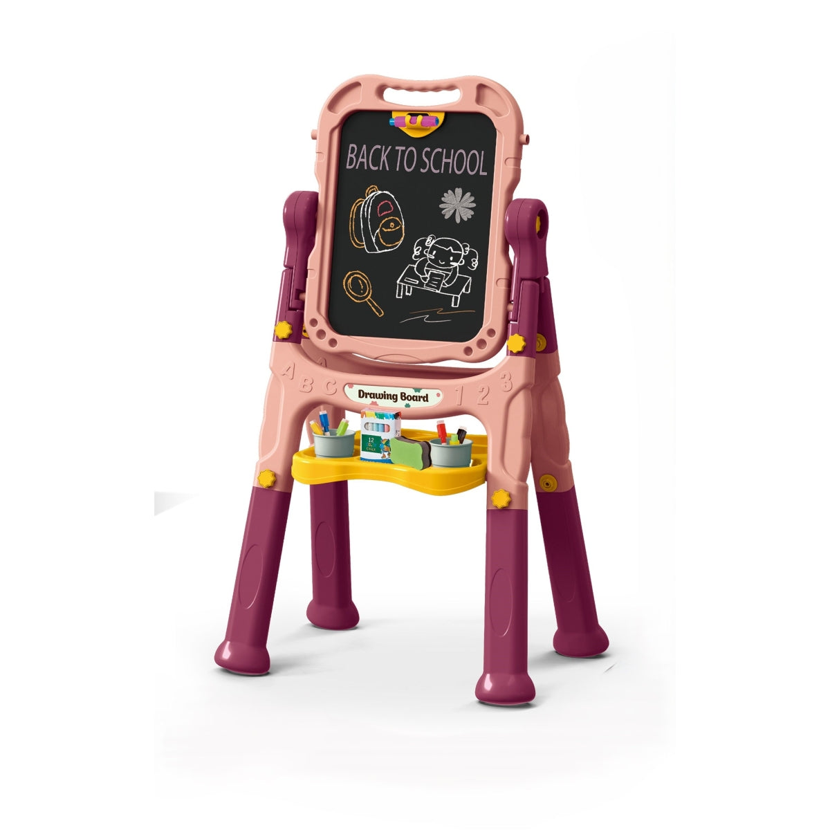 לוח ציור מגנטי דו צדדי המעודד את הילדים לחקור את הפוטנציאל האמנותי שלהם. זהו לוח ציור רב שימושי בו הצבעים מתעוררים לחיים, הרעיונות מתעצבים והדמיונות משתוללים.: ניתן להשתמש בו כלוח גירים צבעוניים, כלוח ציור תוך שימוש בצבעי המים המצורפים, לחבר דפי ציור לתוך הקליפס המובנה בלוח ולצייר על הדפים ככל העולה על הדמיון, כלוח מגנטים – גם בצד השחור וגם בצד הלבן. לוח הציור מצויד ברגליים הניתנות להתאמה בהתאם לגובה הילדים, כך שניתן לצייר גם בעמידה וגם בישיבה. הגובה המתכוונן של לוח הציור מבטיח שהוא יגדל לצד ילדכם, מותאם לכישוריו המתפתחים ומאפשר לילד נוחות מירבית. הלוח מעוצב עם קצוות חלקים ופינות מעוגלות כדי להבטיח הבטיחות במהלך השימוש. תורם לילדים בפיתוח תיאום עין-יד, מספק להם מרחב לביטוי ויצירה חופשיים ומעודד אותם לפתח את הכישורים המוטוריים וכישוריהם האמנותיים באמצעות ציור ותרגול. זהו שילוב של כיף ולמידה: בנוסף לטיפוח מיומנויות אמנותיות, זוהי הזדמנות נפלאה לשלב זמן משחק עם לימוד. ניתן להשתמש בלוח כדי ללמוד מושגי יסוד כגון אותיות, מספרים, צורות ועוד, המאפשרים לילדים ללמוד תוך כדי פעילות יצירתית. הלוח כולל 48 חלקים. הרכבה קלה ופשוטה ללא צורך בכלים מיוחדים. מתאים לילדים מגיל 3 שנים ומעלה. המוצר בטיחותי לשימוש. אינו רעיל. עשוי מפלסטיק איכותי. מידות המוצר : 30*49*88 ס"מ. מידות האריזה : 54*50*17 ס"מ. ארץ ייצור: סין.