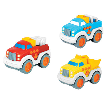 לחץ וסע רכב עבודה. רכב עבודה לחץ וסע מנגן קולות מעולם העבודה ומנגינות שונות. הרכב נוסע בלחיצה על הכפתור הצהוב. קיימים 3 דגמים של רכבים, יש לרשום בהערות ההזמנה את הדגם המועדף - יסופק בהתאם לזמינות במלאי