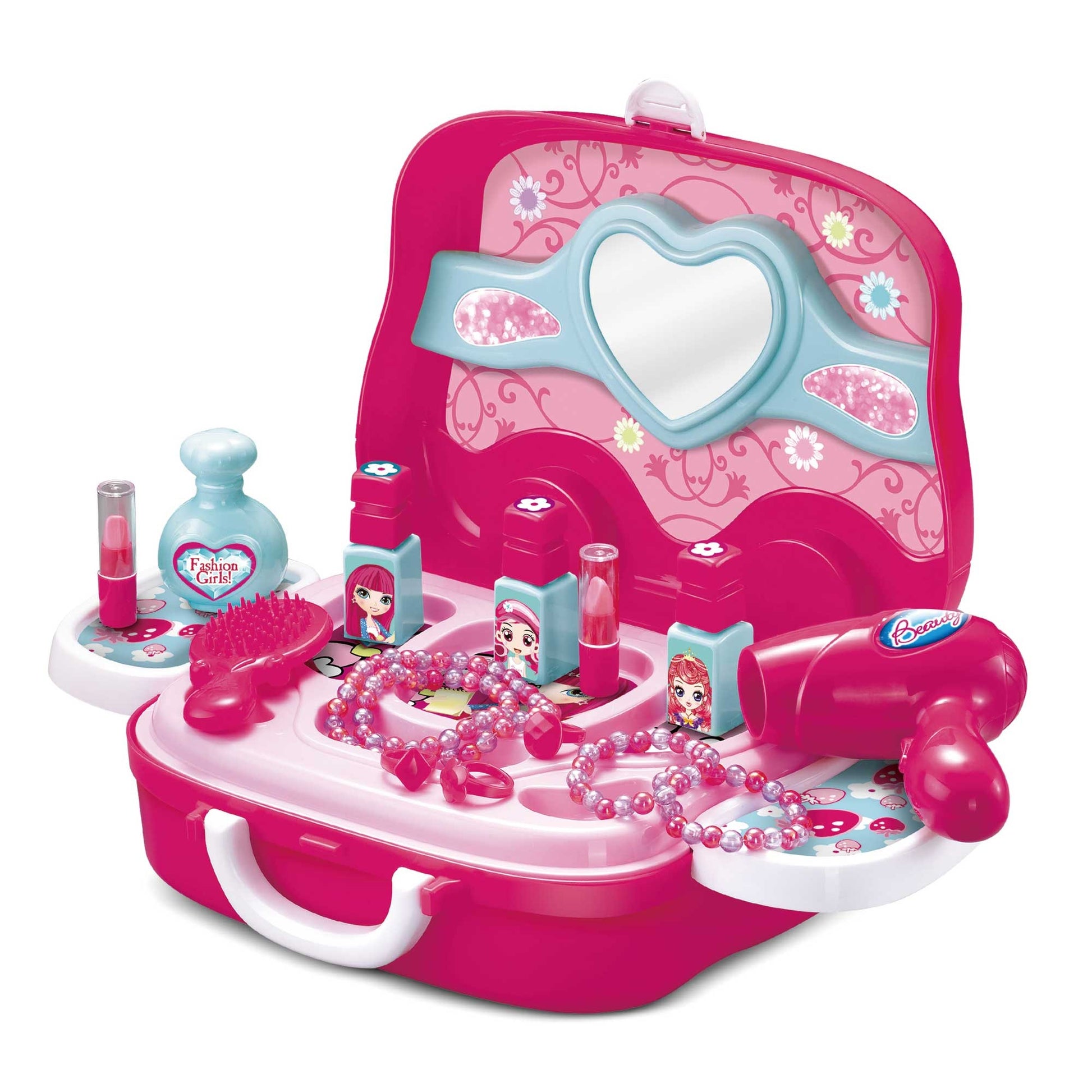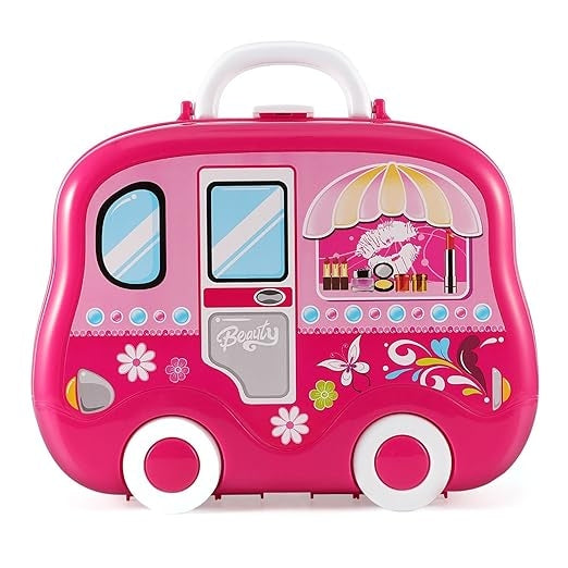 מזוודת יופי ותכשיטים נסיכות. ילדים יכולים להעמיד פנים, לשחק באיפור ובאביזרים של נסיכות! מגיע עם מגוון אביזרים כגון: מברשת, פן לשיער, צמידים, וכלי איפור, בתיק נשיאה שאפשר לקחת לכל מקום! מתאים לגילאי 3+. מידות המזוודה (ס"מ): 38.4 × 24.8 ×26.2. חומר: פלסטיק. ארץ ייצור: סין.