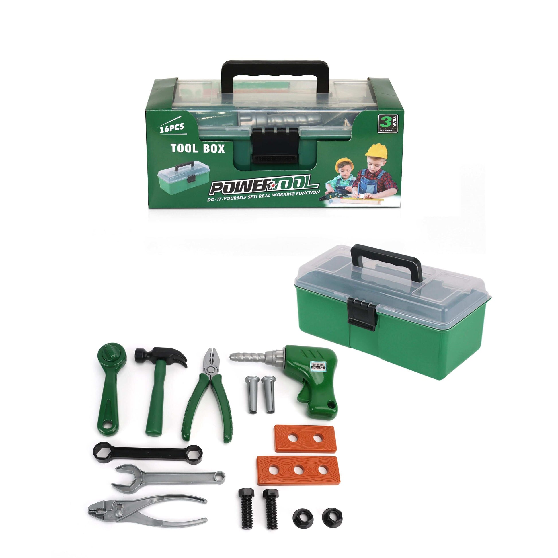 מזוודת כלי עבודה עם סט אביזרים לילדים הכולל 16 חלקים מגוונים: מקדחה, ברגים, פטיש, מברגים, מסור ועוד מגוון כלים. המשחק מפתח מיומנויות מוטריות עדינות ומצוין למשחקי דמיון של כלי עבודה כמו של הגדולים. מיועד לגילאי 3 שנים ומעלה. מידות המוצר (ס"מ): 25*12*10. ארץ ייצור: סין.
