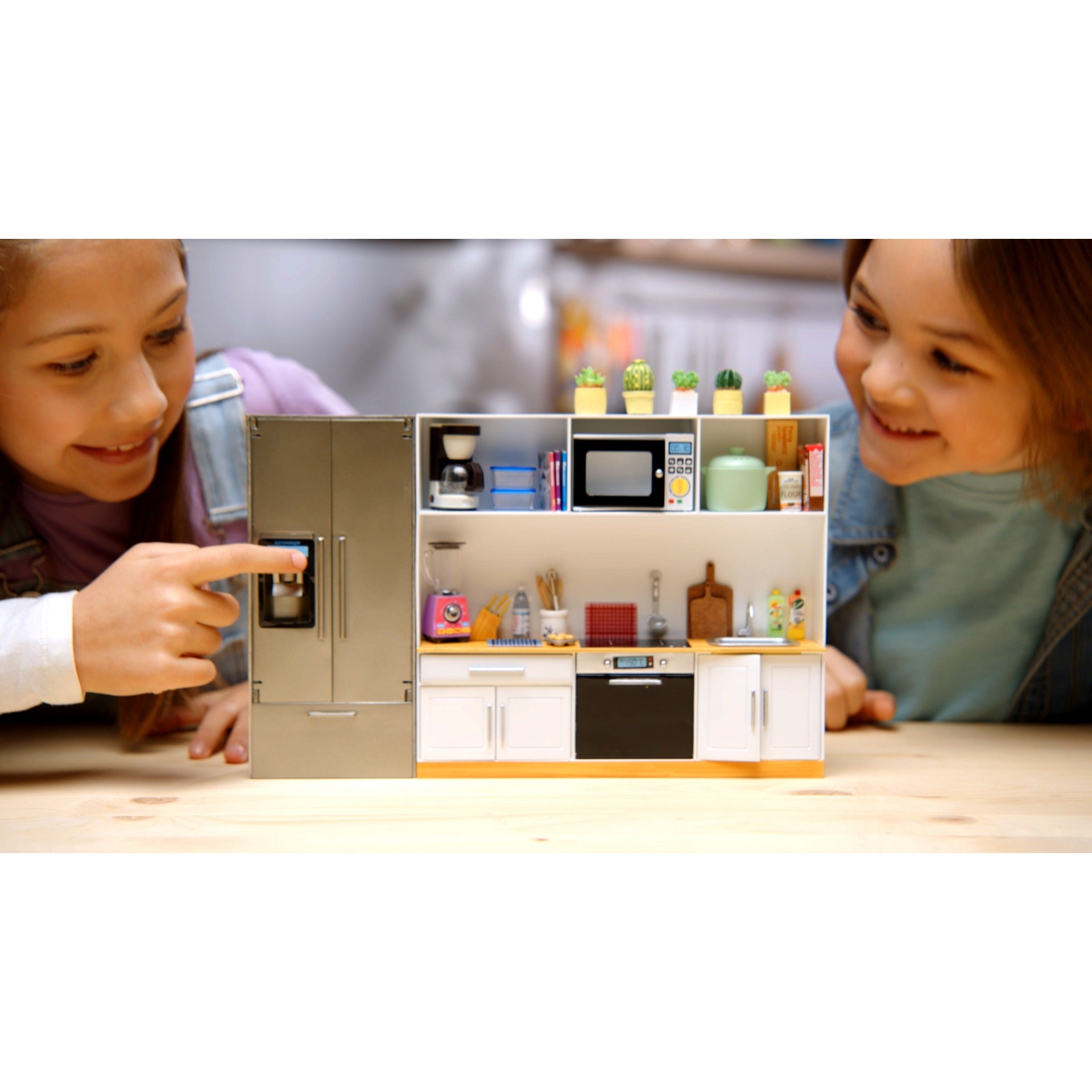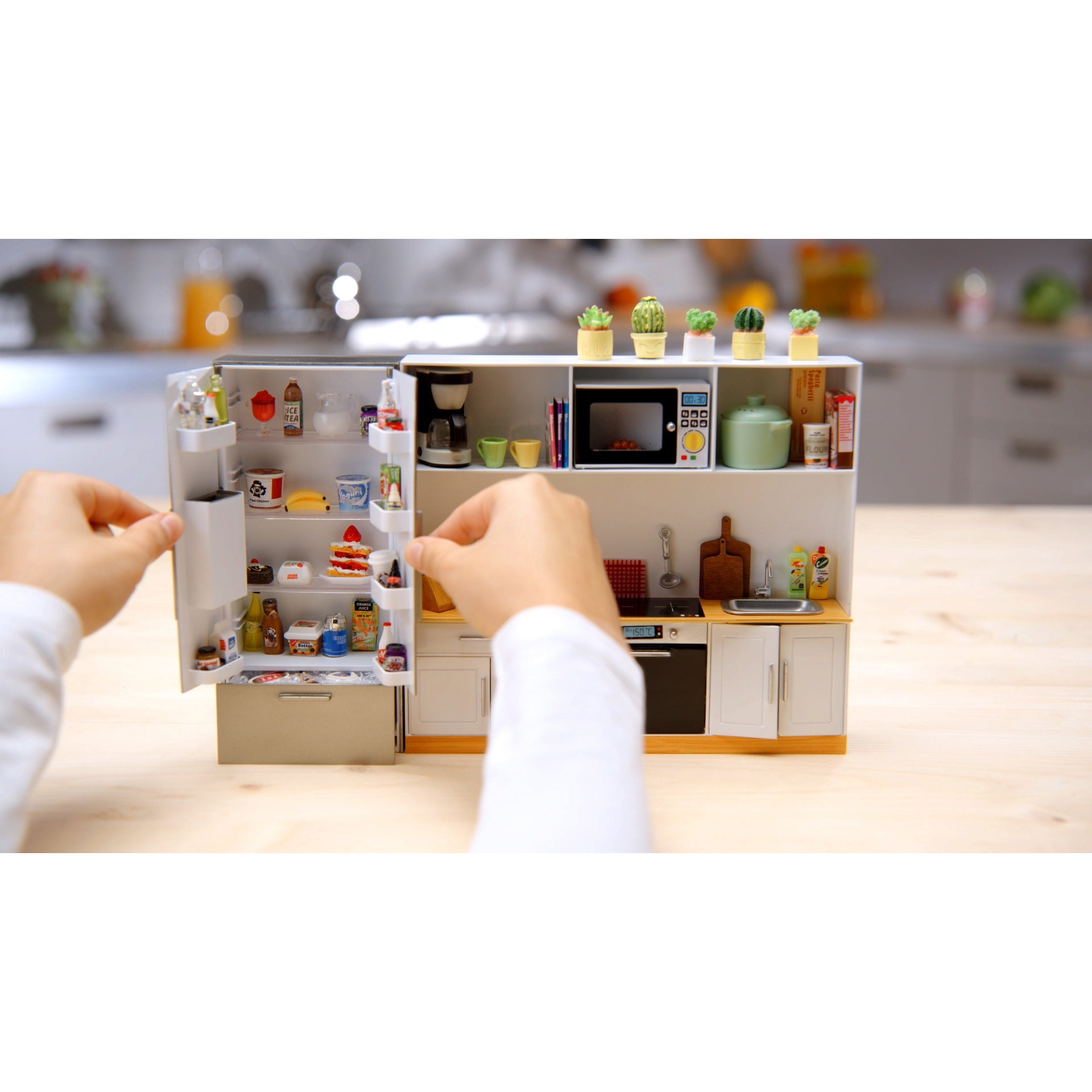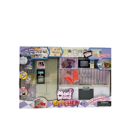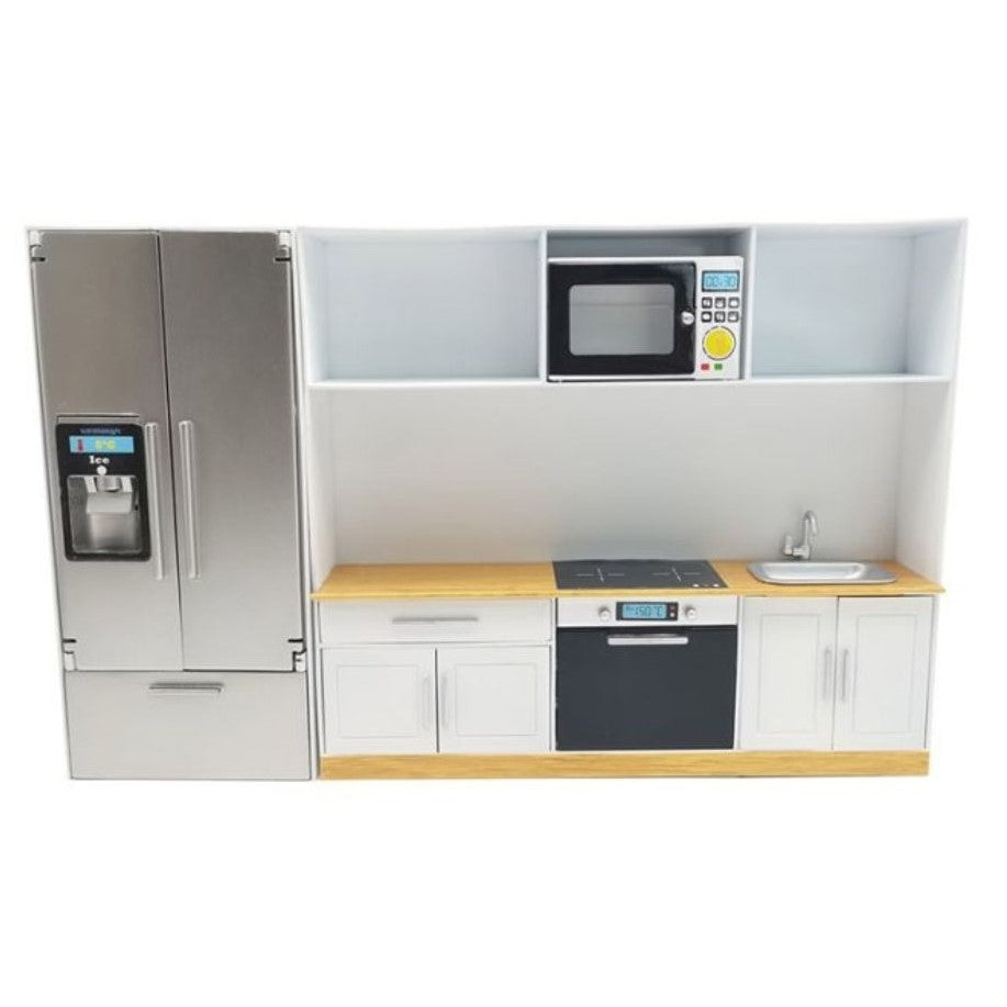 מטבח מיני עם אביזרים כולל: תנור, מיקרוגל, מקררים, מקפיא, מתקן קרח ואביזרים כגון: כפפות, מגבת נייר, ספר בישול, מים, שמן זית ומנקה. חומר: פלסטיק. ארץ ייצור: סין. מיועד לגילאי: 6 שנים ומעלה. מידות: 35*5*20 ס"מ.