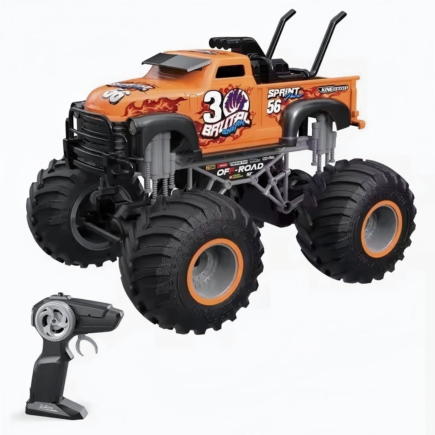 מכונית כתומה על שלט גלגלי שטח 1:16.כיווני נסיעה: קדימה, אחורה, שמאלה, ימינה.  זמן משחק: עד 15 דקות. מרחק שליטה: עד 30 מטר. פועלת באמצעות 8 AA (אינן כלולות – ניתן לרכוש בנפרד). כולל שלט רחוק איכותי לשליטה קלה ונוחה. לגילאי 3 שנים ומעלה. ארץ יצור – סין. חומר – פלסטיק. גודל המוצר(ס"מ):3523*28*26.