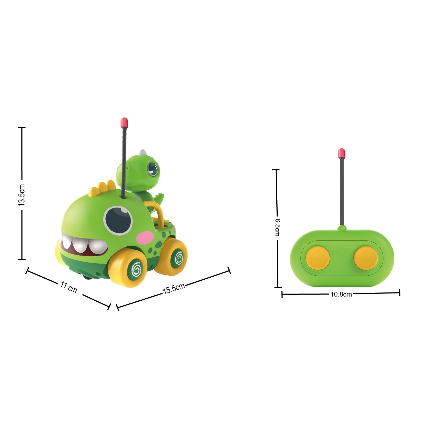 מכונית דינוזאור עם שלט רחוק. כיווני נסיעה : קדימה, אחורה, פנייה ימינה ושמאלה. כוללת מוזיקה וסאונד. ניתן לנתק דינוזאור ולשחק בנפרד. זמן משחק – עד 150 דקות. מרחק שליטה: עד 15 מטר. פועלת באמצעות 3 סוללות AA לרכב ו-2 סוללות AAA לשלט (הסוללות אינן כלולות – ניתן לרכוש בנפרד). שלט רחוק איכותי הפועל על תדר 2.4 גיגה-הרץ לשליטה קלה ונוחה. לגילאי 3 שנים ומעלה. ארץ יצור – סין. חומר – פלסטיק. מידות האריזה:  27X15.5X16  ס"מ גודל המוצר: 27*15.5*16 ס"מ