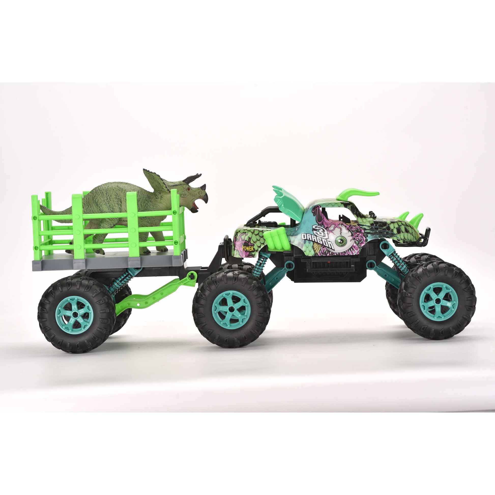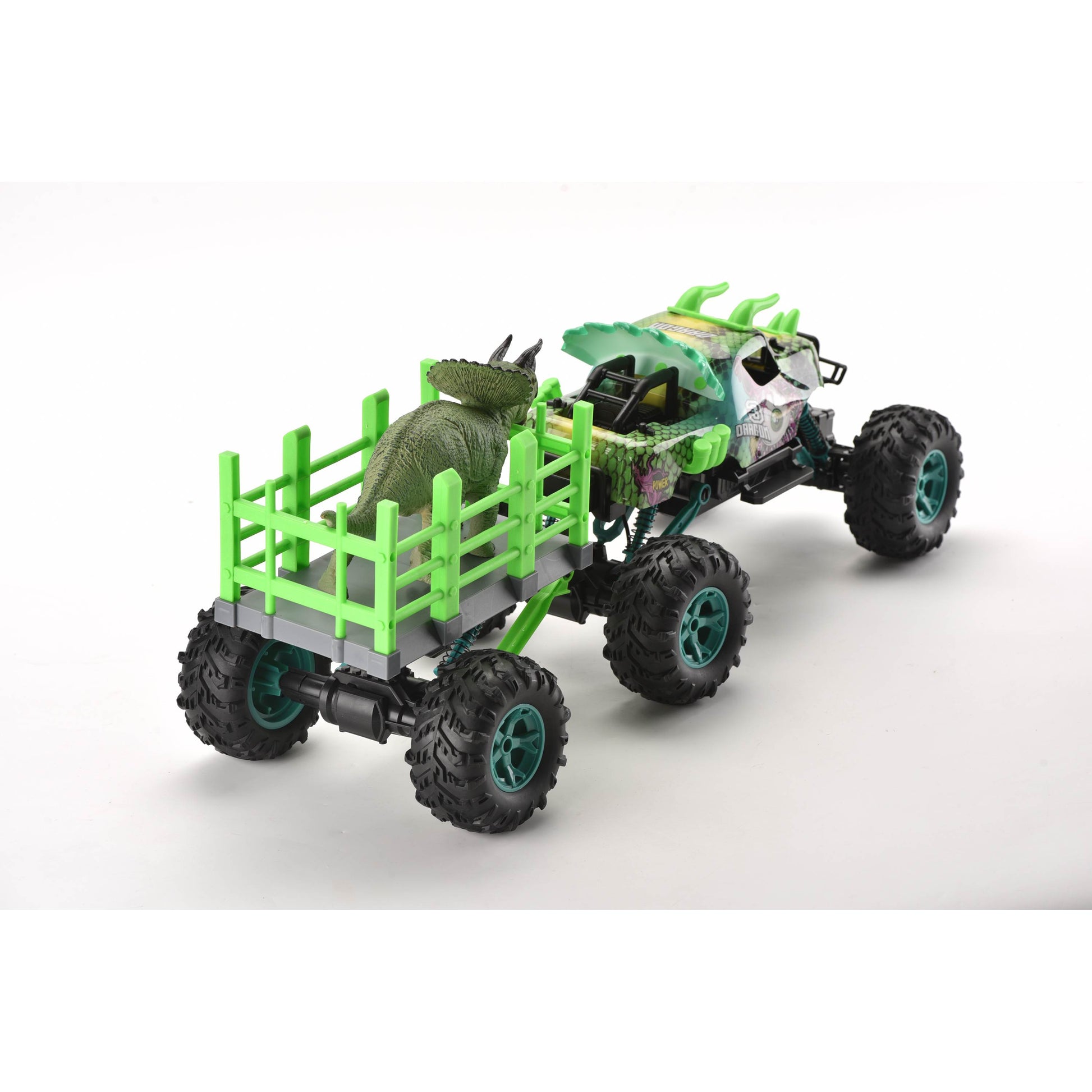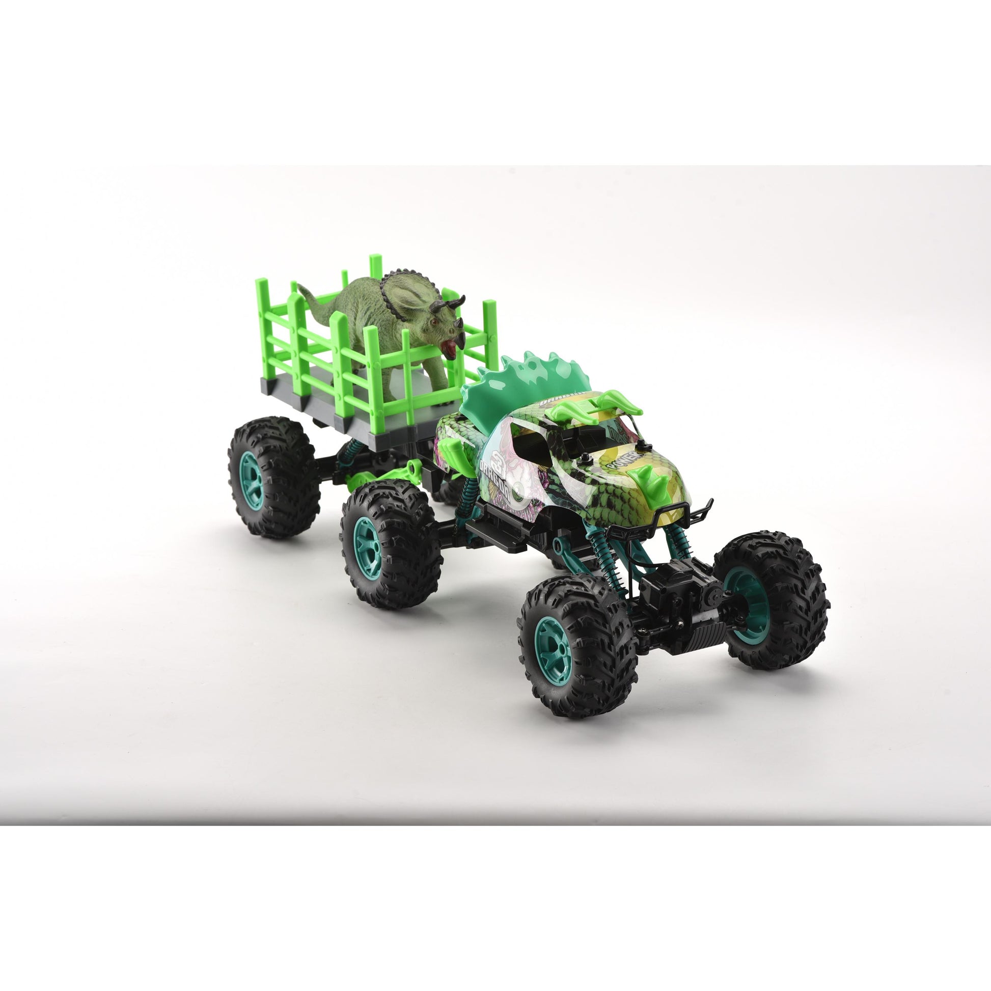 מכונית עם שלט רחוק בקנה מידה 1:14. עם טריילר להובלת דינוזאור. שלדה מתכווננת מעלה ומטה. כיווני נסיעה: קדימה, אחורה, פנייה שמאלה וימינה. מהירות: עד 15 קמ"ש. זמן משחק – עד 20 דקות. מרחק שליטה: עד 25 מטר. זמן טעינה: 4 שעות. פועלת באמצעות סוללת ליתיום פנימית 7.4V בטעינת USB (כלולה) ו-2 סוללות AA (אינן כלולות – ניתן לרכוש בנפרד). שלט רחוק איכותי הפועל על תדר 2.4 גיגה-הרץ לשליטה קלה ונוחה. לגילאי 3 שנים ומעלה. ארץ יצור – סין. חומר – פלסטיק. מידות האריזה: 65.5X24X27.1 ס"מ