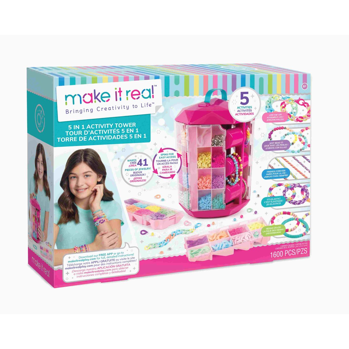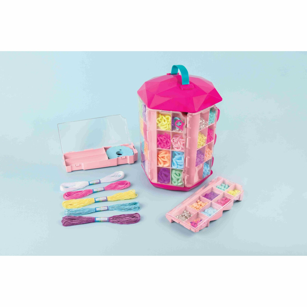 כולל 5 פעילויות תכשיטים נהדרות בפתרון אחסון אחד! המעמד מסתובב לגישה נוחה, בעל תאי אחסון נשלפים ומתלה צמידים להצגת היצירות.