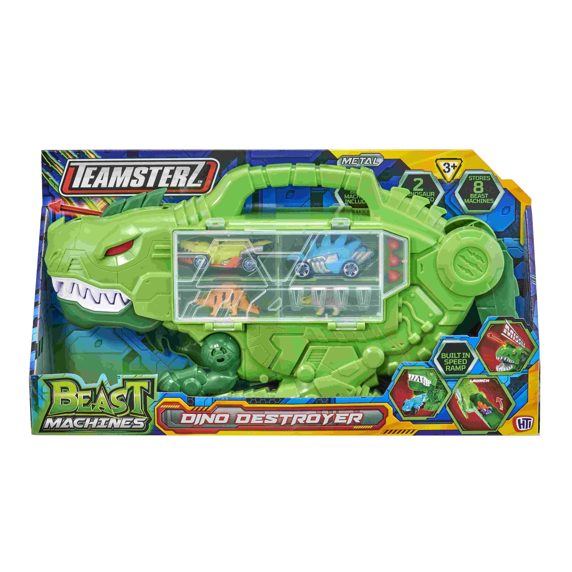 משחתת דינוזאור מבית המותג Teamsterz. שגרו את המכונית דרך המשחתת באמצעות המשגר, המכונית תצא דרך הלסת של הדינוזאור. השתמשו במשגר הטילים כדי לשגר את 3 הטילים על ידי לחיצה על הכפתור שבראש הדינוזאור. המוצר כולל 2 מכוניות, 2 דינוזאורים קטנים ו-3 טילים. כל מכונית כוללת גלגלים עצמאיים הנעים בחופשיות והיא בגודל של כ 7.6 ס"מ. המשחתת קלה לדחיפה באמצעות הגלגלים העצמאיים הנעים בחופשיות. בעלת יכולת אחסון משני הצדדים ונפח אחסון של עד 8 מכוניות. כוללת גם ידית נשיאה, קל לקחת ממקום למקום. נותן השראה לילדכם לחקור וליהנות מהעולם הסובב אותו, מסייע להתפתחות הקוגניטיבית, המוטוריקה העדינה והמיומנויות החברתיות של ילדיכם. למשחק מלא דמיון, משחק תפקידים והנאה! מתאים לגילאי 3 שנים ומעלה מידות המוצר : 21*8.8*39 ס"מ. מידות האריזה : 22*9*41 ס"מ. ארץ יצור- סין. חומר- פלסטיק.