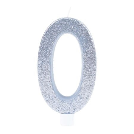 נר יום הולדת מעוצב בצורת הספרה 0 בגוון לבן עם נצנוץ כסוף מרהיב.