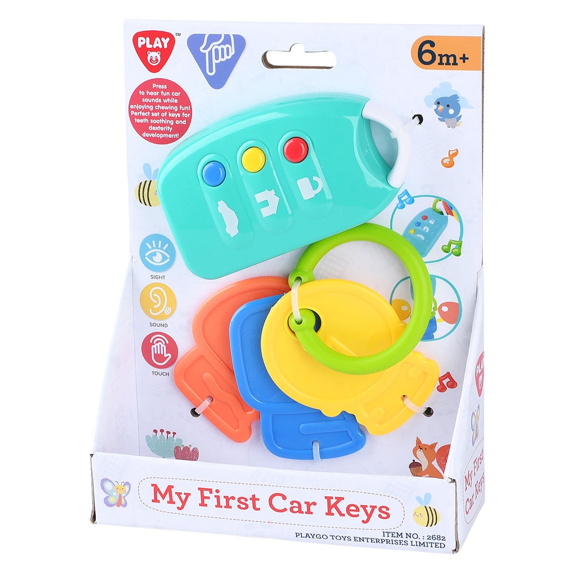 סט מפתחות בצבעים בהירים, מפתח מיומנויות מוטוריות עדינות, באמצעות לחיצה על על כפתורי הקול הממוקמים על גוף המוצר. במקביל, יישמעו צלילים ואפקטים המאמנים את התפיסה השמיעתית של התינוק. בנוסף מחזיקי המפתחות יכולים לשמש כנשכנים נוחים המעסים את החניכיים של התינוק. מתאים לגילאי 6+ חודשים. ארץ ייצור: סין. גודל המוצר בס"מ: 15*5*20. . נדרשות 2 סוללות AAA (סוללות כלולות).