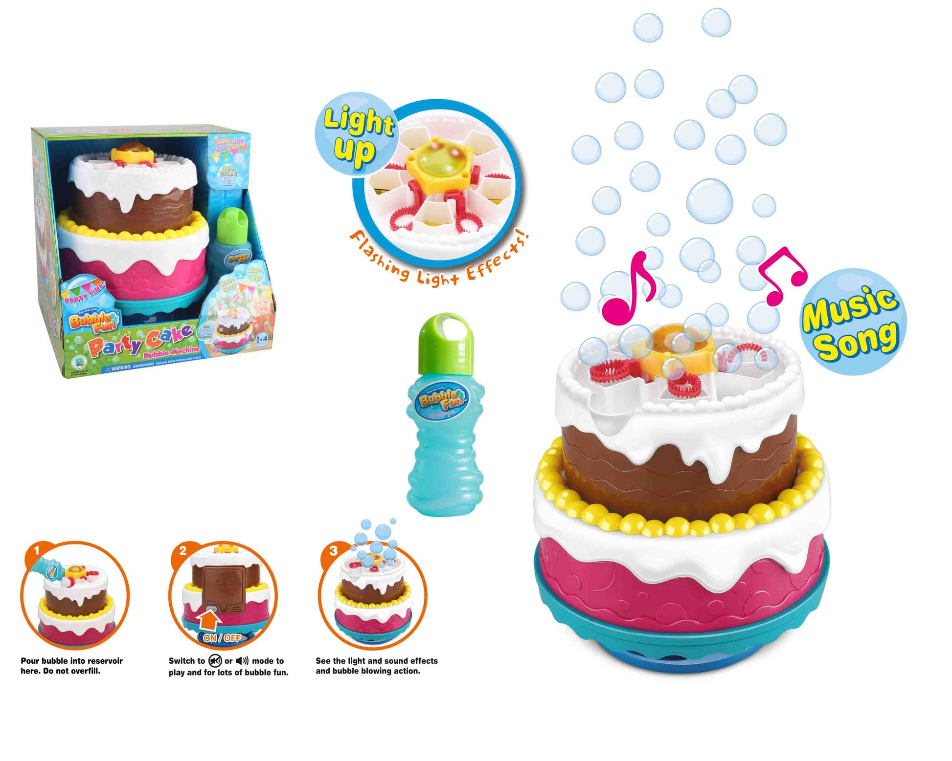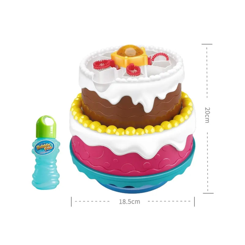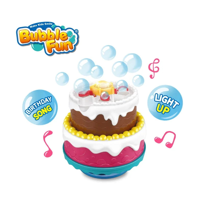 עוגת יומולדת בועות סבון מדליקה! עם צלילים ואורות מהבהבים, מייצרת אלפי בועות סבון בשניות בודדות, מופעלת על סוללות ומשמיעה שירי יומולדת.