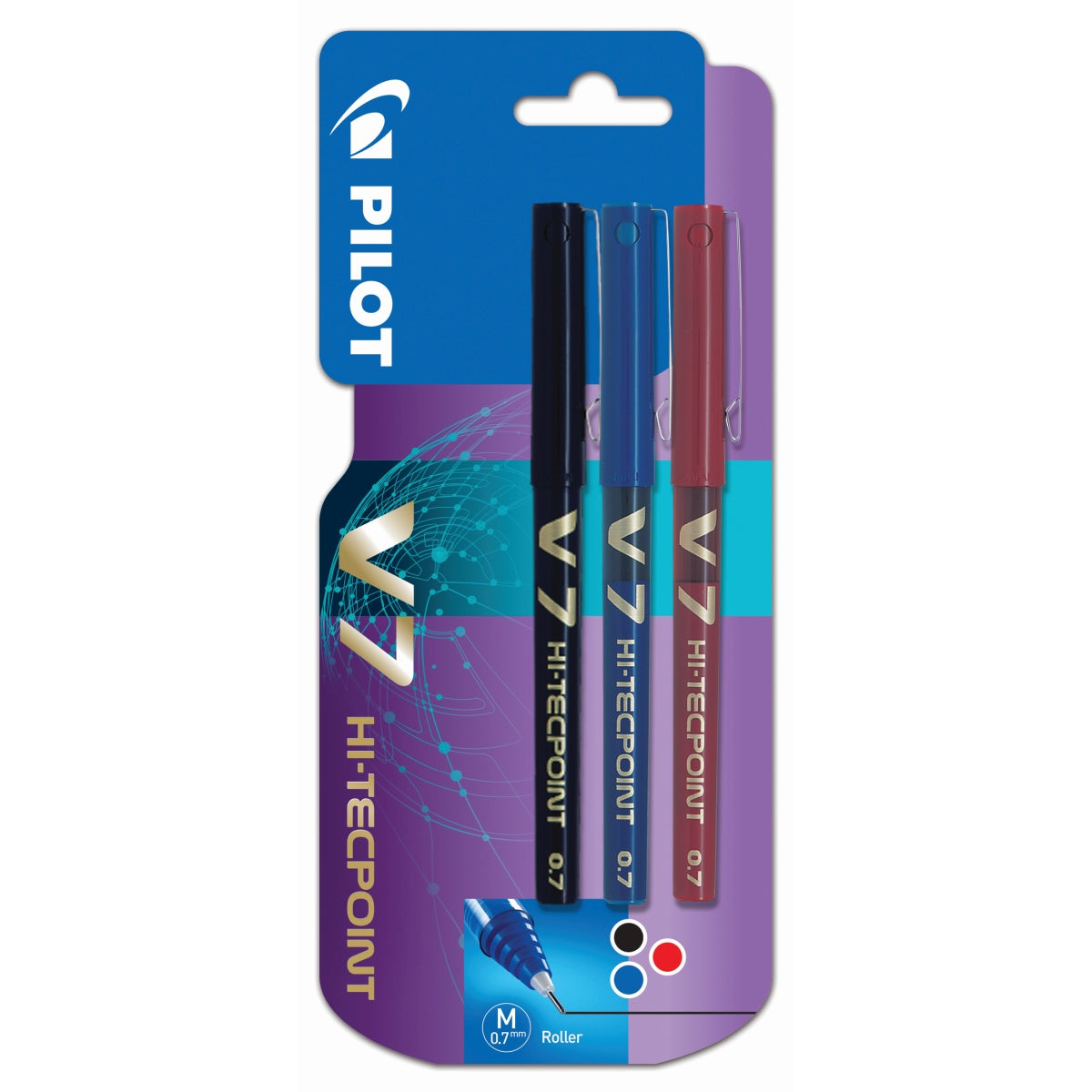 סט עטי PILOT V – שלישייה איכותית בצבעים שחור, כחול ואדום, עם כתיבה חלקה, מדויקת וזורמת.