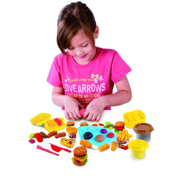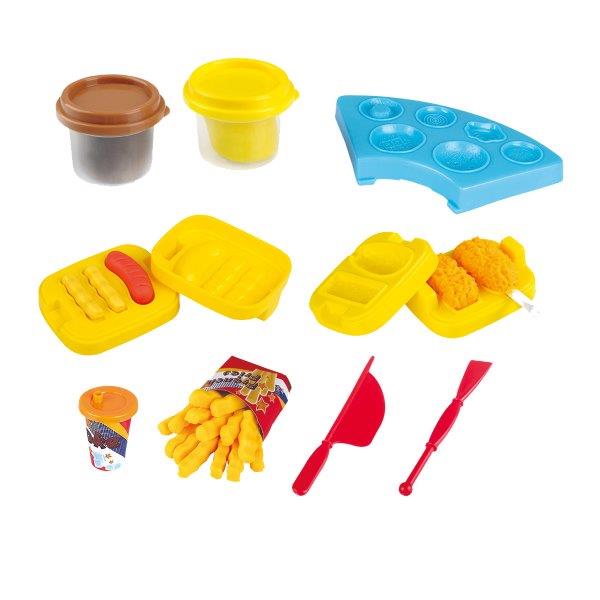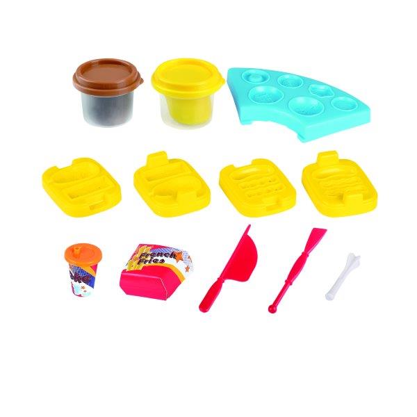 ערכת יצירה בבצק, להכנה ויצירה של אוכל מהיר, בשלל צורות. הערכה מגיע יחד עם 2 גביעי בצק, בצבעים שונים, חותכי צורות ומגוון אביזרים שונים, ליצירה בבצק.