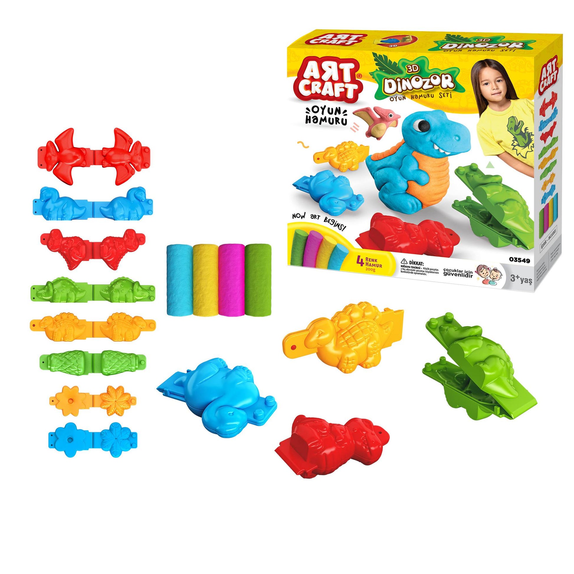 ערכת בצק לעיצוב ויצירה- דינוזאור. הערכה כוללת 4 צבעים שונים של בצק במשקל כולל של 200 גרם ו-8 שבלונות תלת מימד להכנת דינוזאורים. • מאפשר לילדים לעצב, ללוש וליצור דמויות של דינוזאורים. עם הבצק אפשר להשתמש גם ליצור צורות ואובייקטים שונים אחרים ללא הגבלה. הבצק אינו מלכלכך ואינו נוזלי. ניתן לעיצוב מחדש שוב ושוב. הבצק עשוי מחומרים באיכות מעולה, רכים, נעימים למגע ובטוח לשימוש! • ניתן לערבב צבעים שונים כדי לקבל יותר צבעים • יש לאחסן במקום קריר. • אם המסה התקשתה, אפשר להוסיף מעט מים ולערבב היטב. השבלונות עשויות מפלסטיק יציב ואיכותי. מידות אריזת המוצר : 22*6*22 ס"מ. מתאים לילדים מגיל 3 שנים ומעלה.