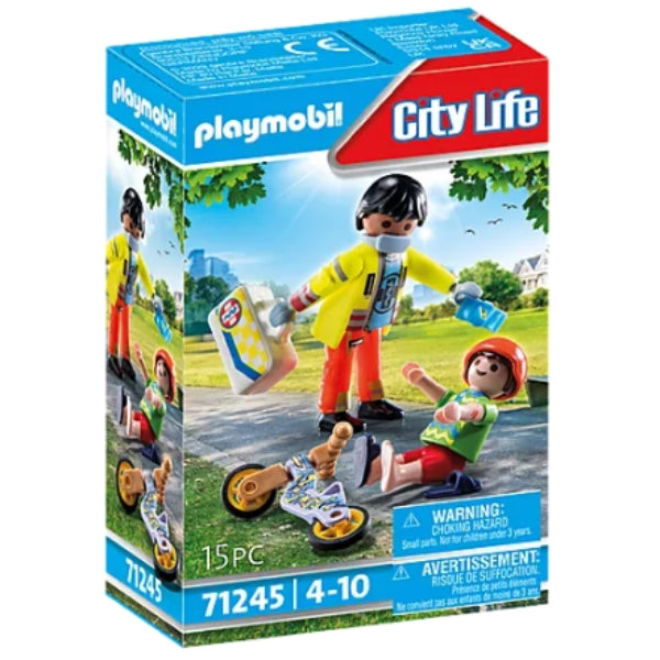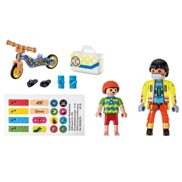הפרמדיק האכפתי תמיד מוכן לעזור. לטיפול ראשוני בפציעות, יש לו את ערכת העזרה הראשונה שלו עם הרבה תחבושות. הערכה כוללת 2 דמויות פליימוביל, קטנוע, ערכת עזרה ראשונה, סדים לתחבושת, קסדה ועוד תוספות. עם תוויות הגבס המצורפות ניתן לרפא פצעים. ה"פציעות" בזרוע וברגל של דמות הילד עשויות מצבע רגיש לחום, הנעלמות בעת שפשוף והופכות לגלות שוב לאחר הקירור. מסיכת פה, קסדה וכפכפי רחצה ניתנים להסרה. לגילאי 4 שנים ומעלה. חומר-פלסטיק.