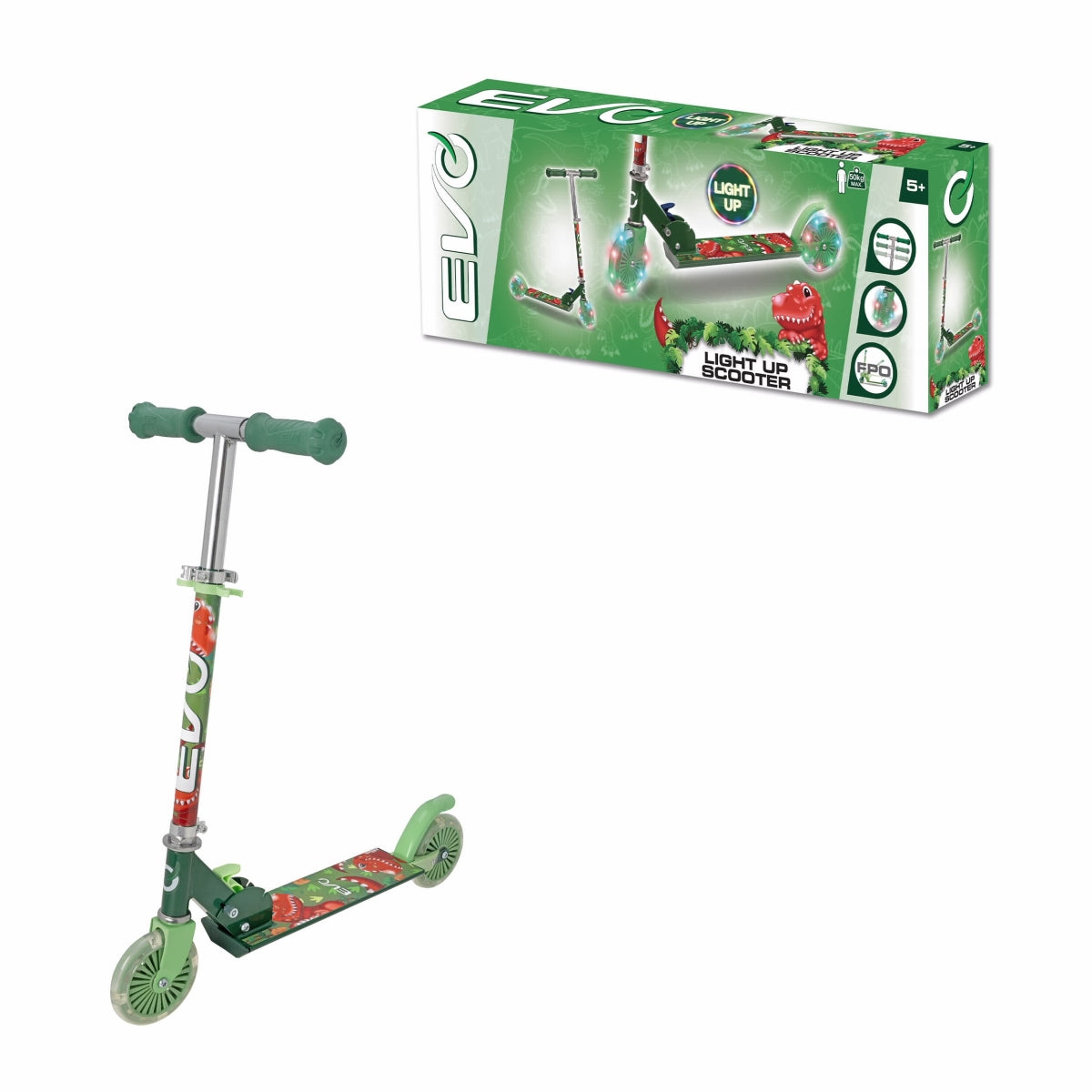 קורקינט 2 גלגלים בעיצוב דינוזאור עם גלגלים מאירים, מבית המותג EVO! הקורקינט מצוייד בכידון מתכוונן בגובה 67-77 ס"מ, ידיות אחיזה נוחות TPR שמתאימות לגודל כף היד של הילד, בלם רגל אחורי, מיסבים ABEC-5, גלגלים מאירים 120 מ"מ. המסגרת עשוייה פלדה. ניתן לקיפול לצורך אחסון ונשיאה קלה ממקום למקום. מתאים לילדים מגיל 5 שנים ומעלה ועד משקל מירבי של 50 ק"ג. נדרשת הרכבה על ידי מבוגר. מיוצר בסין. נדרשות 4 סוללות AAA (לא כלולות – לרכישה בנפרד). משקל המוצר: 2.7 ק"ג. מידות המוצר מורכב: 67-77*32*67 ס"מ. מידות אריזה: 22*10*59.5 ס"מ