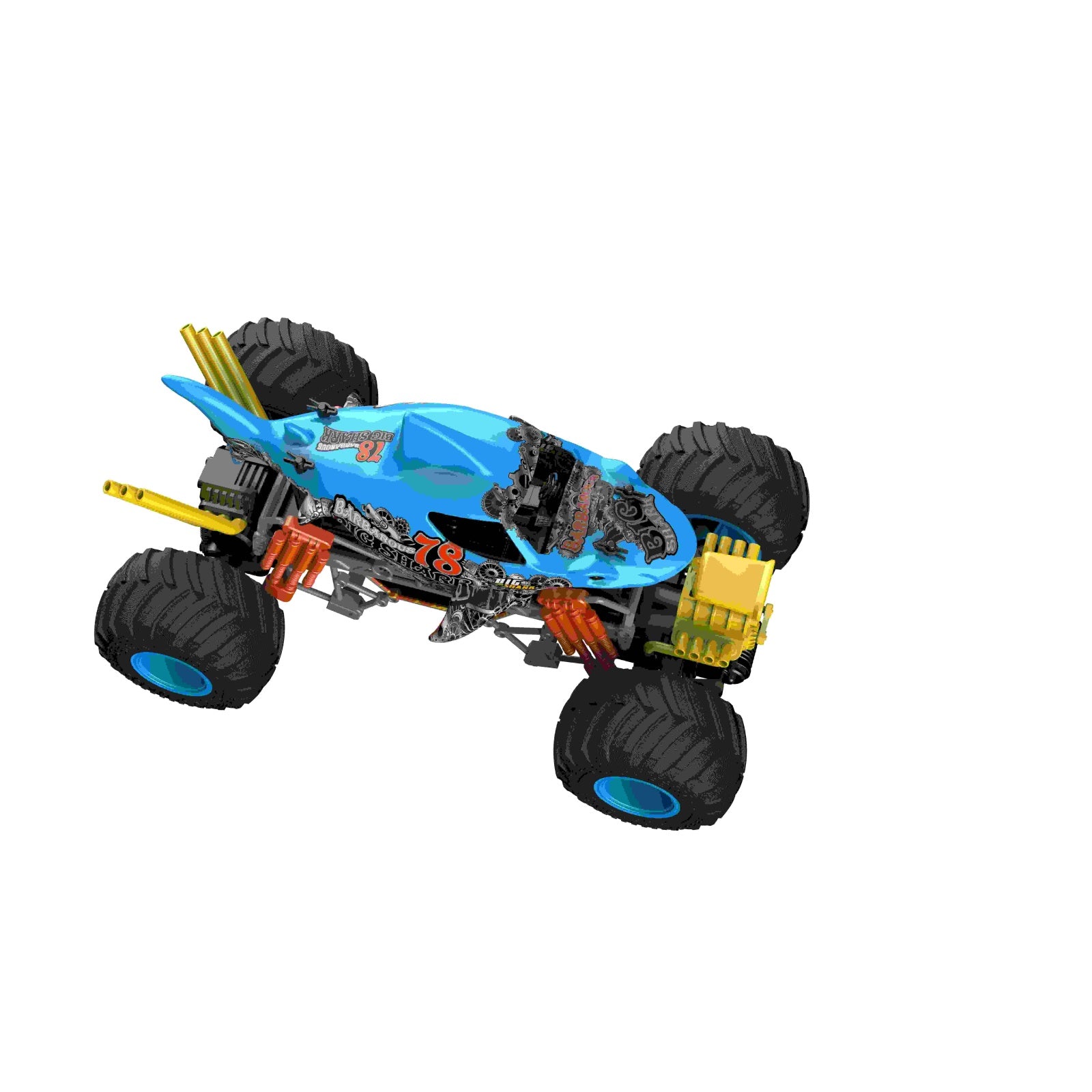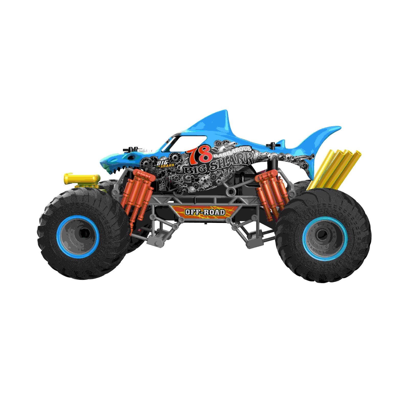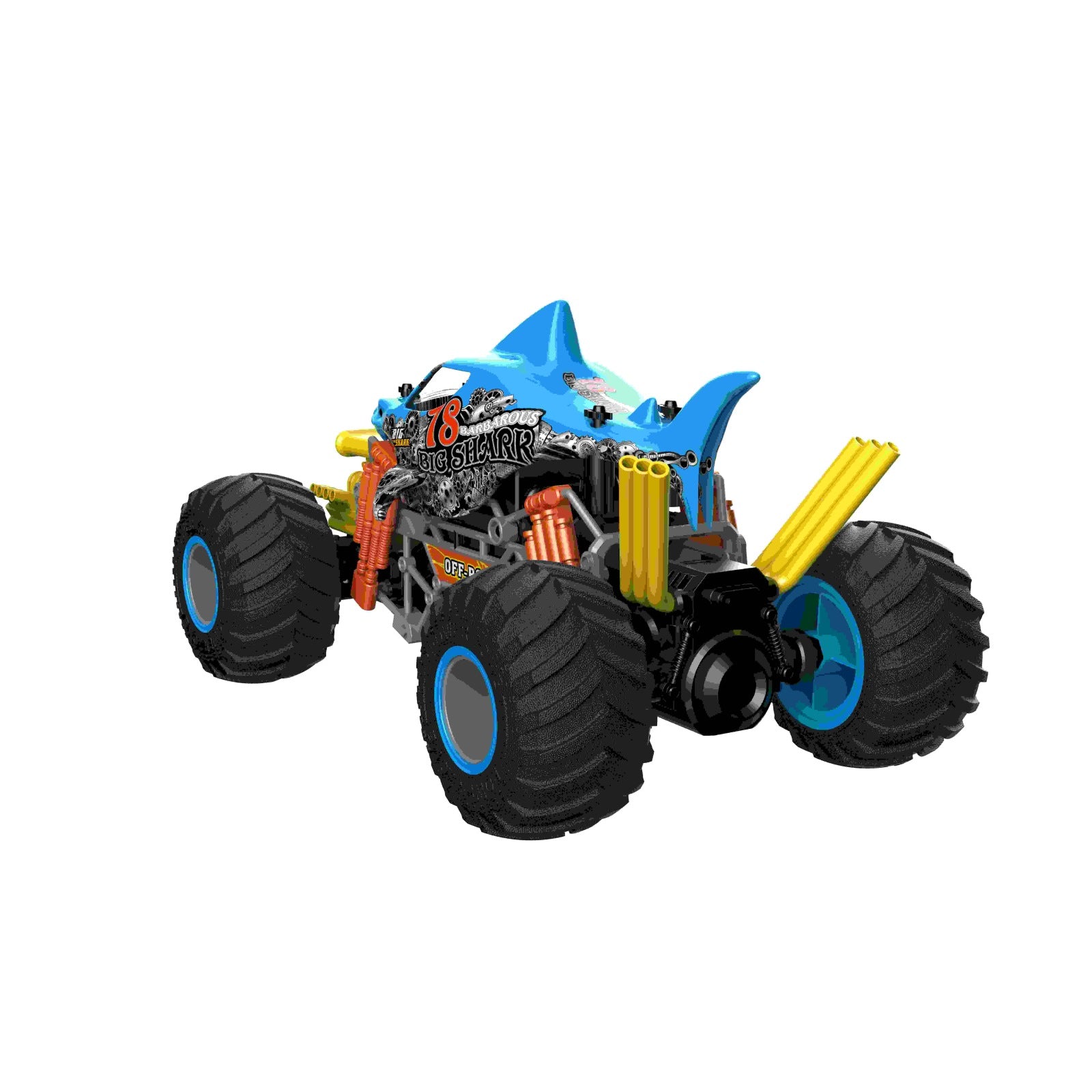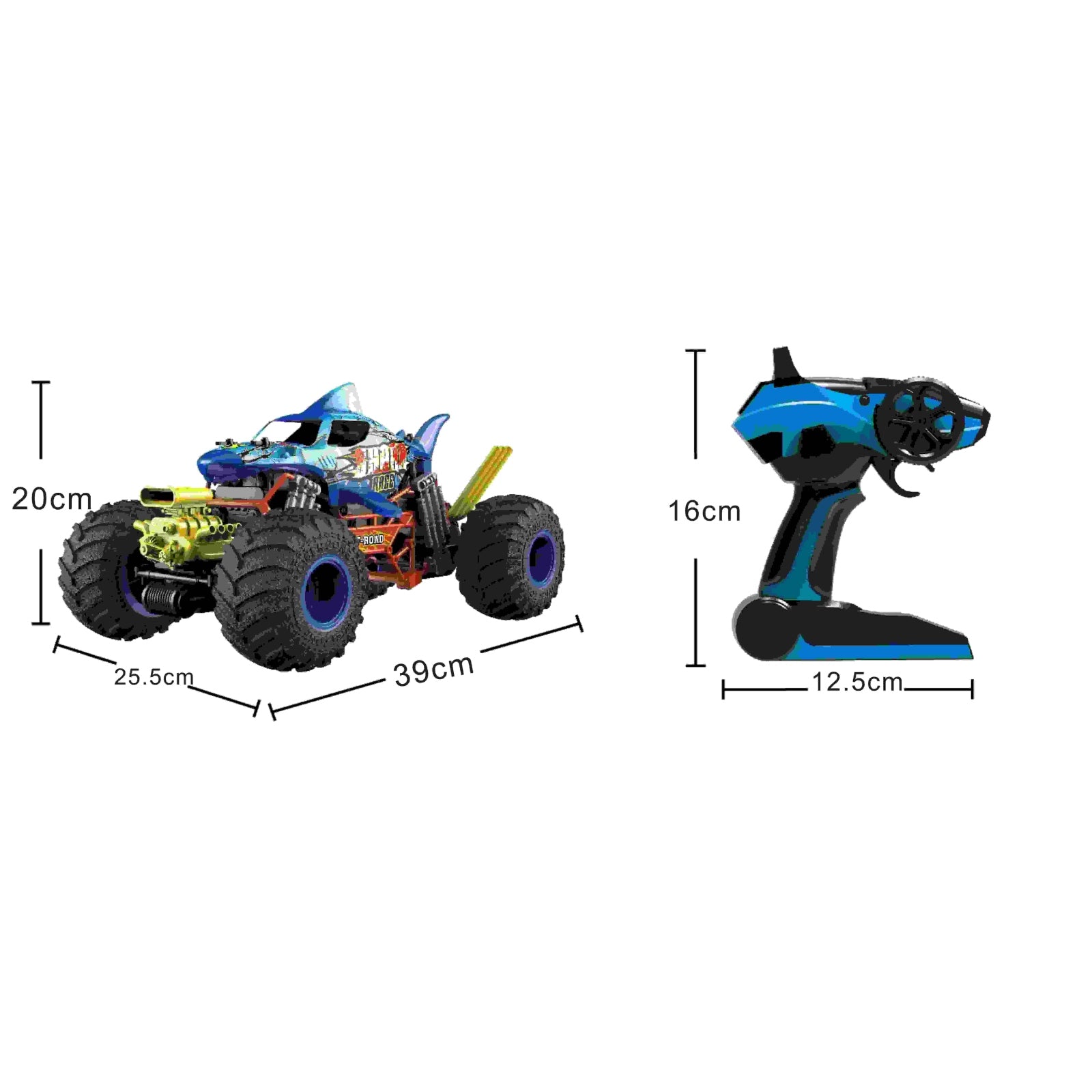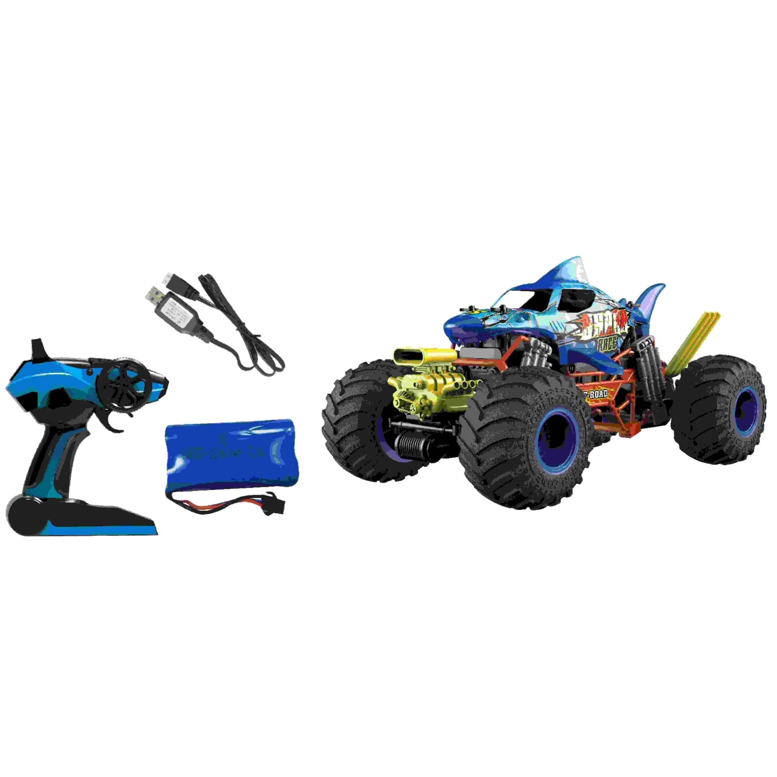 רכב עם שלט רחוק בעיצוב כריש ובקנה מידה 1:10. גלגלים גדולים. אפקט עשן. הדמיית רטט מנוע. כיווני נסיעה: קדימה, אחורה, פנייה שמאלה וימינה. מהירות: עד 15 קמ"ש. זמן משחק – עד 20 דקות. מרחק שליטה: עד 25 מטר. זמן טעינה: 3.5 שעות. פועל באמצעות סוללת ליתיום פנימית 7.4V בטעינת USB (כלולה) ו-2 סוללות AA (אינן כלולות – ניתן לרכוש בנפרד). שלט רחוק איכותי הפועל על תדר 2.4 גיגה-הרץ לשליטה קלה ונוחה. לגילאי 3 שנים ומעלה. ארץ יצור – סין. חומר – פלסטיק. מידות האריזה: 54X28X27 ס"מ גודל המוצר: 54*28*27 ס"מ