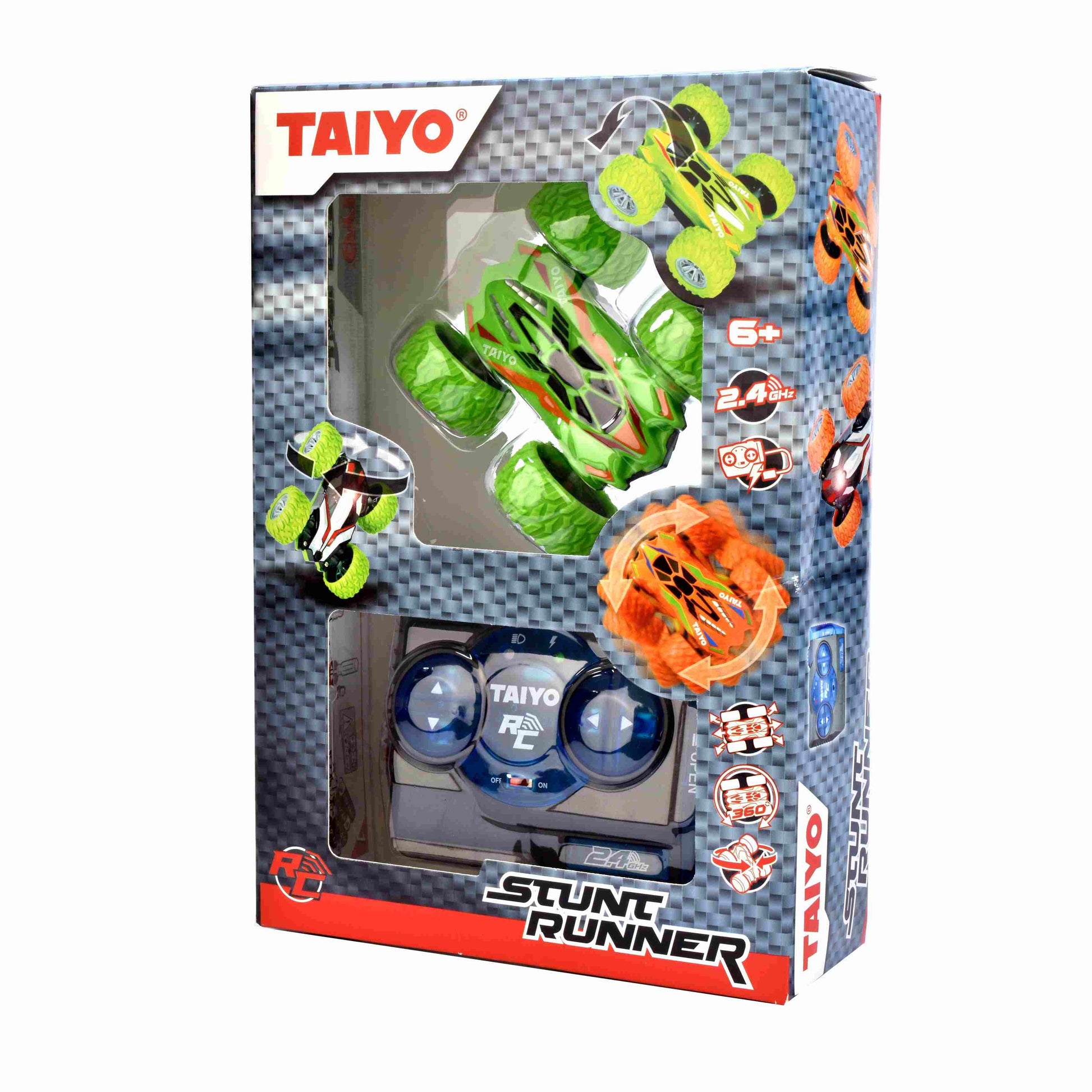 מכונית Stunt Runner עם שלט רחוק עוצמתית ובעלת ביצועים מדהימים, נוסעת לכל הכיוונים, מסתובבת ומתהפכת 360 מעלות. בעלת שלט רחוק איכותי הפועל על תדר 2.4 גיגה-הרץ - לשליטה קלה ונוחה. המכונית פועלת באמצעות 3 סוללות AA (לא כלולות – ניתן לרכוש בנפרד) וסוללת -2.4V (כלולה) נטענת. מתאים לילדים מגילאי 6 שנים ומעלה. מיוצר בסין. מידות הרכב : רוחב 8 ס"מ עומק 7.5 ס"מ גובה 3.5 ס"מ. מידות אריזה : רוחב 15.5 ס"מ עומק 6.5 ס"מ גובה 22.50 ס"מ.