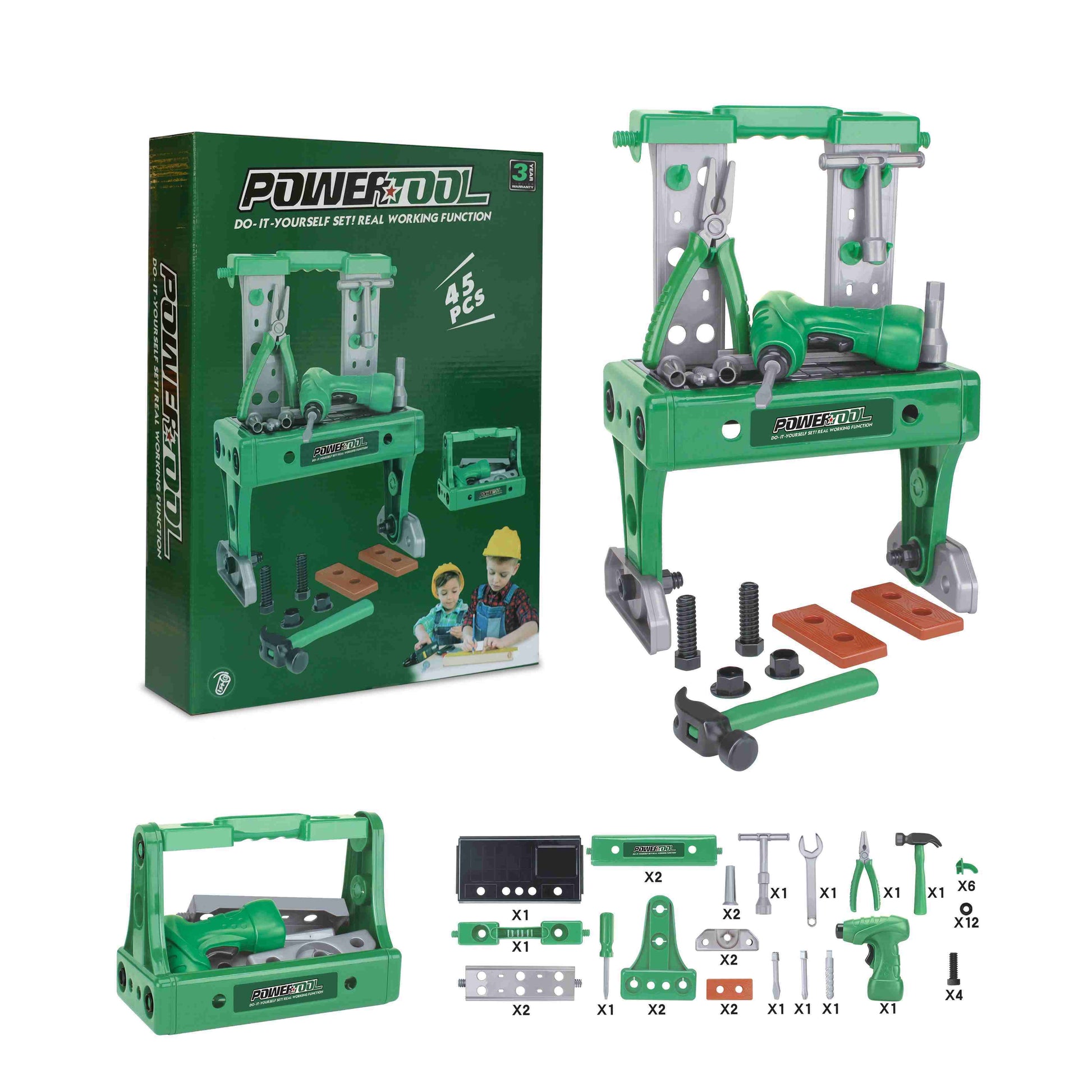 שולחן כלי עבודה הכולל 45 אביזרים מגוונים: פטיש, מקדחה, מברגים ועוד. מושלם לילדים האוהבים לבנות ולעבוד עם ידיהם. ערכת הכלים המהנה הזו מאפשרת לילדכם לבטא את היצירתיות שלהם ולתת לדמיון שלהם להשתולל! מיועד לגילאי 3 שנים ומעלה. מידות המוצר (ס"מ): 27.5*14.5*40. ארץ ייצור: סין. נדרשות 2 סוללות AA (הסוללות אינן כלולות – ניתנות לרכישה בנפרד).