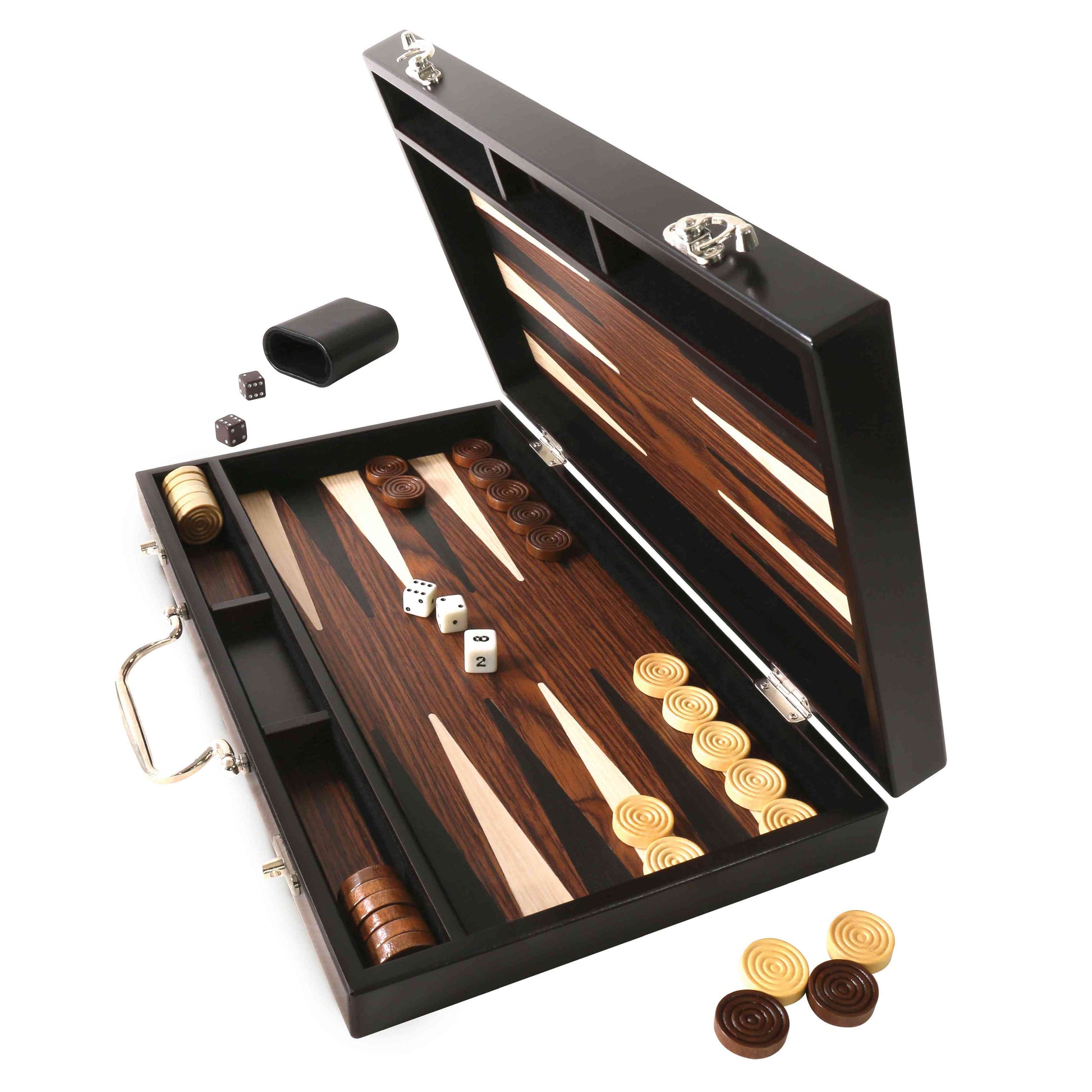 סט שש בש זה כולל ציפויי עץ טבעי ואבני שש בש מגולפות ביד. המארז מתקפל לצורת תיק נוח עם ידית כסופה וכולל 2 שייקרים דמוי עור ו-5 קוביות. שש-בש הוא משחק לשני שחקנים שבו לכל שחקן יש חמישה עשר כלים הנעים בין עשרים וארבעה משולשים לפי הטלת שתי קוביות. מטרת המשחק היא להיות ראשונים להזיז את כל חמישה עשר הדמקה מהלוח. כמו כל המשחקים הגדולים, זה כרוך בשילוב של אסטרטגיה ומזל. בעוד שהקוביות עשויות לקבוע את התוצאה של משחק בודד, השחקן הטוב יותר יצבור את השיא הטוב יותר על פני סדרה של משחקים רבים. עם כל זריקת קובייה, על השחקנים לבחור מבין אפשרויות רבות להזזת הדמקה שלהם ולצפות מהלכי נגד אפשריים של היריב. ארץ ייצור: סין. מתאים לגילאי: 6+. גודל המוצר (ס"מ): 38*23*5.5.