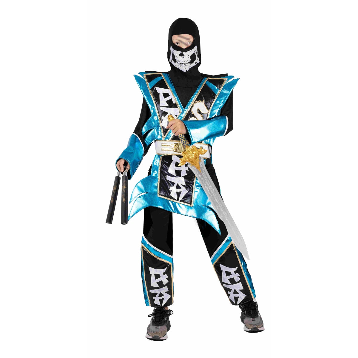 תחפושת נינג'ה כחולה לבנים מבית שושי זוהר, מידה 12. תחפושת מושלמת לכל ילד שמחפש להיות נינג'ה מקצועי בשנה הקרובה! הבגד עשוי מבדים איכותיים ונעים, עם עיצוב מרהיב הכולל פרטי זהב שמוסיפים לו מראה לוחמני ומרשים. עם תחפושת זו, הילד ירגיש כמו לוחם אמיתי, מוכן לכל משימה קרבית. אידיאלית לפסטיבלים, מסיבות תחפושות ותחפושת פורים שתעשה רושם בכל מקום!