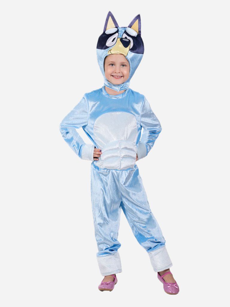 התחפושת מעוצבת כדי להיראות בדיוק כמו הדמות האהובה בלואי (Bluey) מהסדרה המצוירת, עם צבעי כחול עזים האופייניים לה.